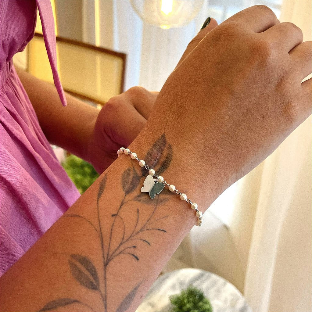 Delicada, charmosa e cheia de significado, a Pulseira de Pérolas com Pingente Borboleta 3D folheada em Steel é perfeita para quem ama acessórios românticos com um toque moderno.