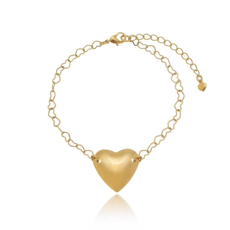 Pulseira Elo Corações E Coração Liso Folheado a Ouro 18K