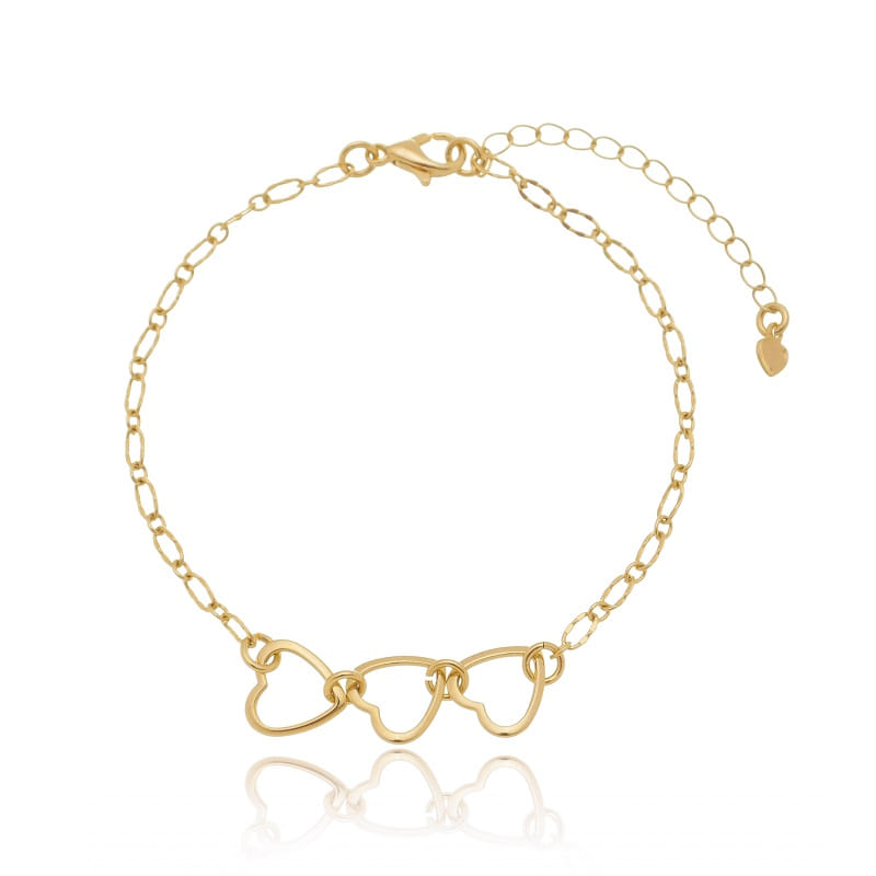 Pulseira Elo Oval 3 Corações Vazados Folheado a Ouro 18K