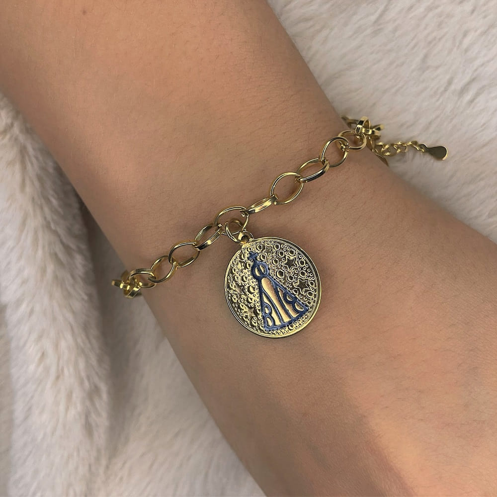 Pulseira Elo Pingentes Gratidao Cruz E Nossa Senhora Aparecida Azul Folheado a Ouro 18K