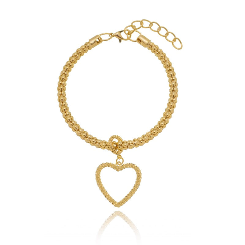 Pulseira Elo Pipoca Pingente Coração Vazado Granitado Folheado a Ouro 18K