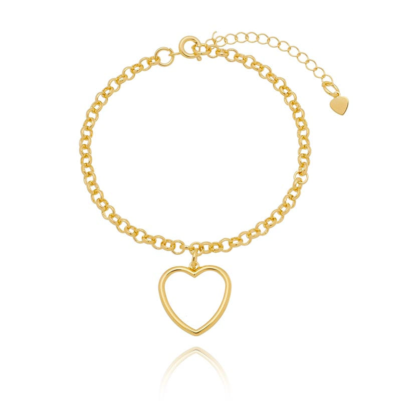 Pulseira Elo Português Pingente Coração Vazado Folheado a Ouro 18K