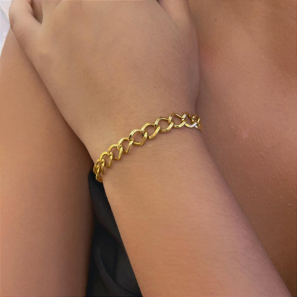 Folheada a Ouro 18K, a pulseira possui um acabamento polido que garante brilho e refinamento, tornando-se uma escolha perfeita tanto para o uso diário quanto para ocasiões especiais. Sua estrutura versátil permite que seja usada sozinha, como peça de destaque, ou combinada com outras pulseiras para composições mais elaboradas.