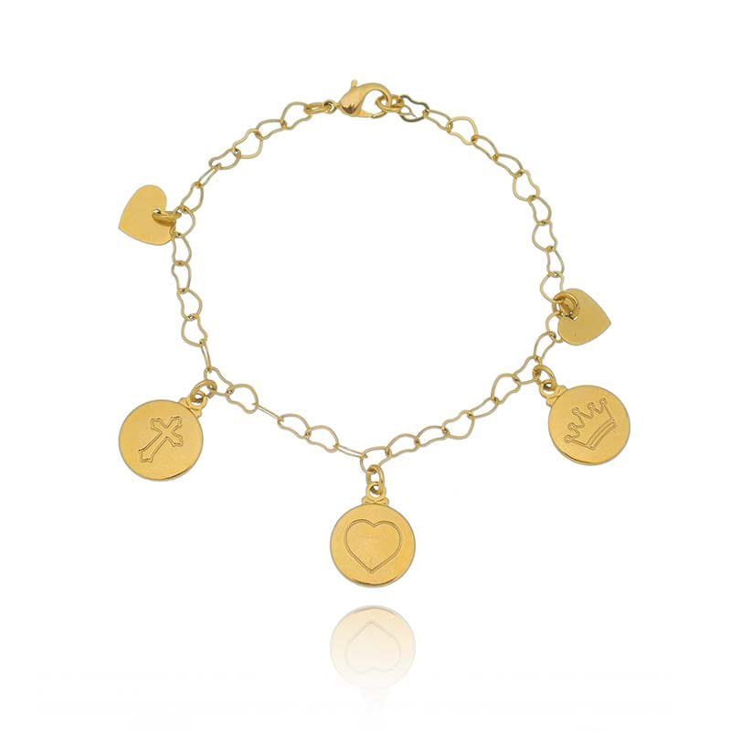 Pulseira Elos Corações Pingentes Medalhas Folheado a Ouro 18K
