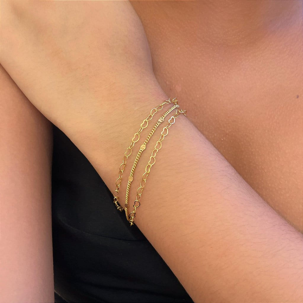 Folheada a Ouro 18K, o acabamento polido garante um brilho refinado e duradouro, destacando os detalhes dos corações e conferindo um toque de sofisticação à peça. Ideal para diversas ocasiões, ela pode ser usada sozinha como destaque ou combinada com outras pulseiras para um visual mais elaborado e moderno.