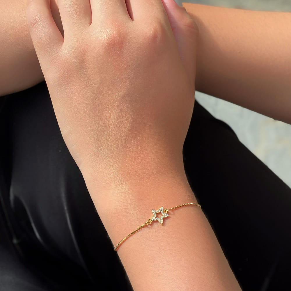 A Pulseira Veneziana Estrela Cravejada, folheada a Ouro 18K, destaca-se pelo seu design delicado e sofisticado, perfeito para quem busca um toque de elegância e brilho no dia a dia. Com um pingente em formato de estrela cravejada com zircônias brilhantes, esta pulseira oferece um visual encantador e luxuoso.