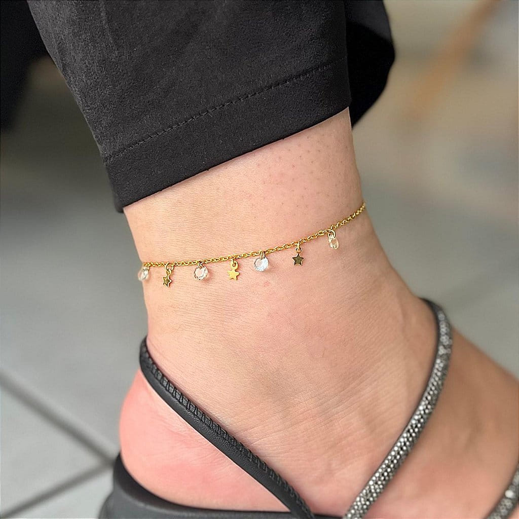 Descrição: Esta charmosa tornozeleira apresenta pingentes de cristal candy e estrelas, proporcionando um visual divertido e elegante. Folheada a ouro 18k, a tornozeleira combina a delicadeza dos cristais com o brilho das estrelas, criando uma peça sofisticada e versátil. Feita com materiais de alta qualidade, esta tornozeleira é perfeita para quem busca um acessório que se destaca tanto no dia a dia quanto em ocasiões especiais.