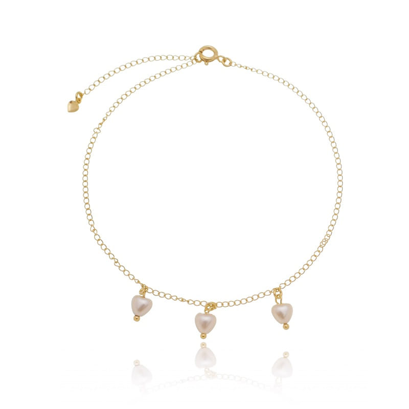 Tornozeleira Pingentes Pérolas Coração Folheado a Ouro 18K