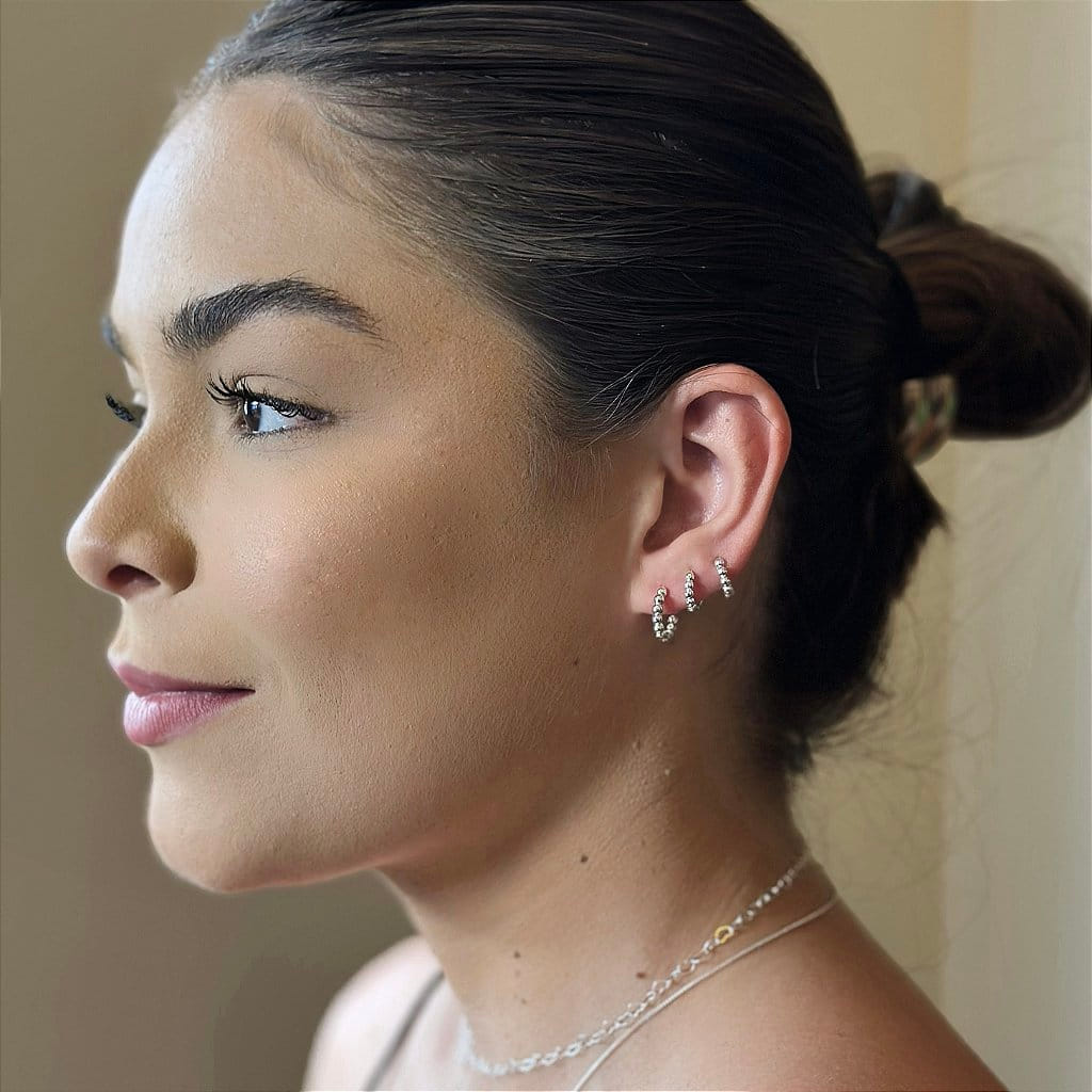 Este trio de argolas apresenta um design moderno com aros decorados por esferas, perfeito para quem busca um acessório elegante e versátil. Folheadas a prata 925, as argolas são confeccionadas com materiais de alta qualidade, ideais para adicionar um toque especial ao seu visual.