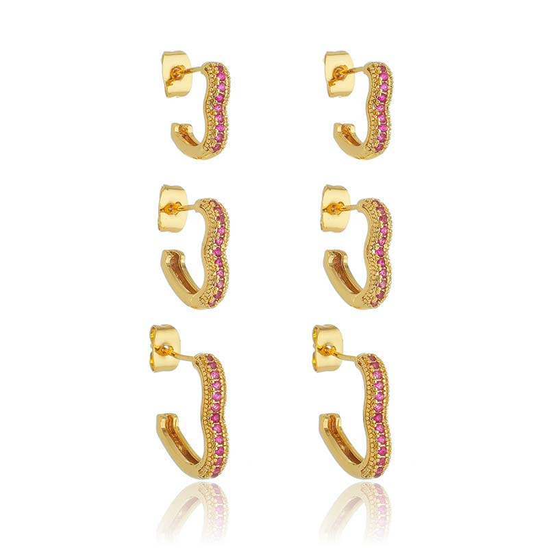 Trio De Argolas Coração Abertas Cravejados Zircônia Rosa Folheado a Ouro 18K