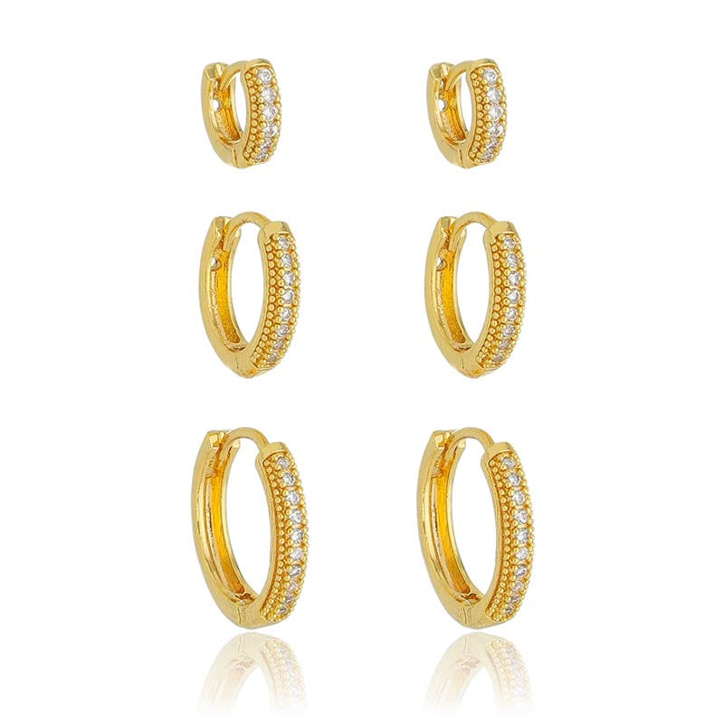 Trio De Argolas Cravejados Cristal Folheado a Ouro 18K