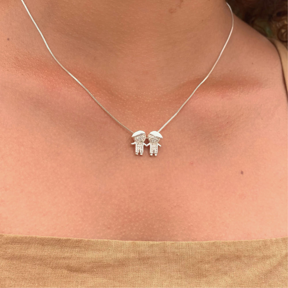 O Colar Dois Meninos Cravejados, folheado a Prata 925, é uma peça encantadora e significativa, ideal para expressar o amor e a união entre irmãos ou filhos. Este colar apresenta dois pingentes em forma de meninos, cada um ricamente cravejado com zircônias brilhantes, que proporcionam um destaque luminoso e sofisticado ao acessório.